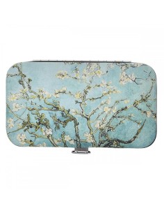 Portamonete tondo con zip, impreziosito dalla riproduzione della celebre opera d'arte di Vincent Van Gogh, 'I Mandorli'.