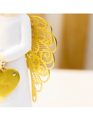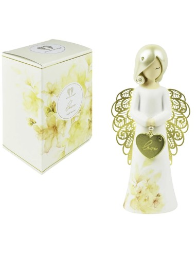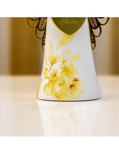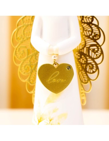 Angelo stilizzato con ali, ciondolo a forma di cuore in metallo smaltato su cui è inciso "Love" e fiori gialli dipinti collezione You are an angel.