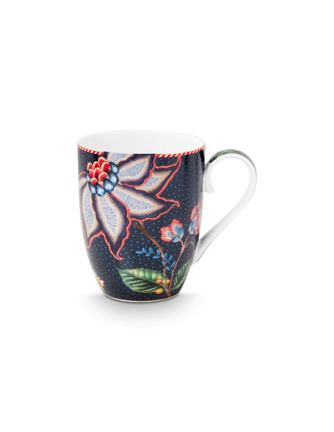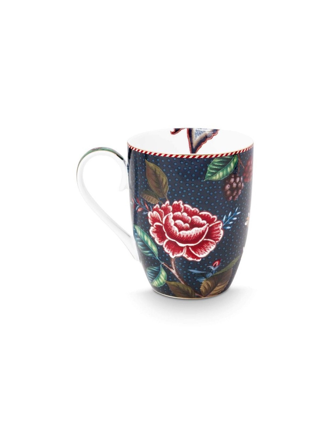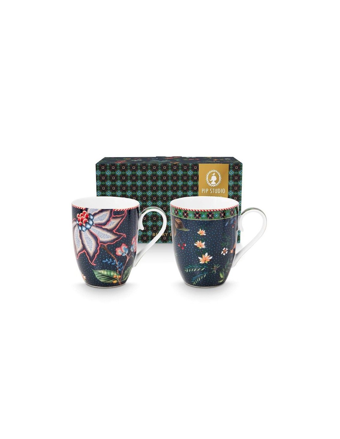 Questo set di 2 tazze grandi fa parte della collezione Berry Blues realizzata da Pip Studio. Il set è composto da due tazze diverse. Entrambe le tazze sono decorate con un motivo floreale blu scuro, con rami su cui crescono eleganti fiori e bacche. I bordi sono rifiniti con dettagli dorati e una sorprendente striscia rossa e bianca.