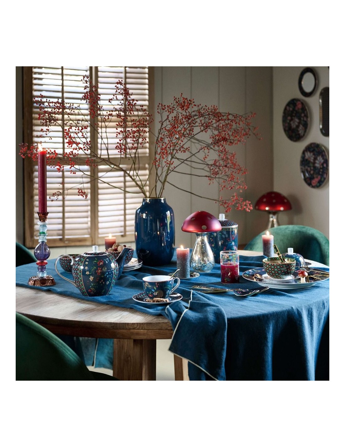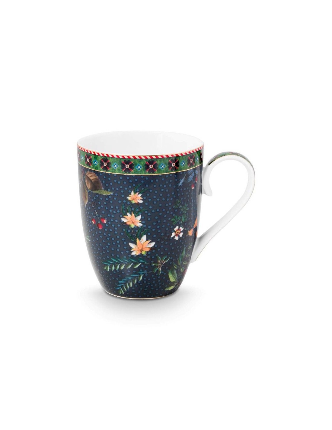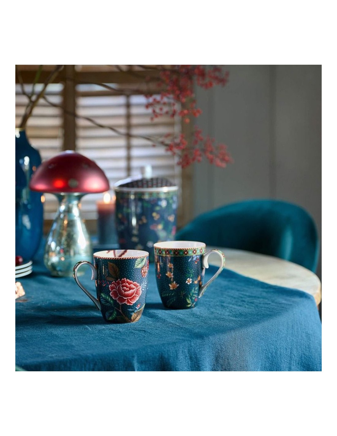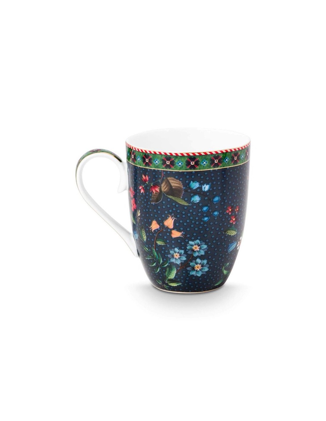 Questo set di 2 tazze grandi fa parte della collezione Berry Blues realizzata da Pip Studio. Il set è composto da due tazze diverse. Entrambe le tazze sono decorate con un motivo floreale blu scuro, con rami su cui crescono eleganti fiori e bacche. I bordi sono rifiniti con dettagli dorati e una sorprendente striscia rossa e bianca.
