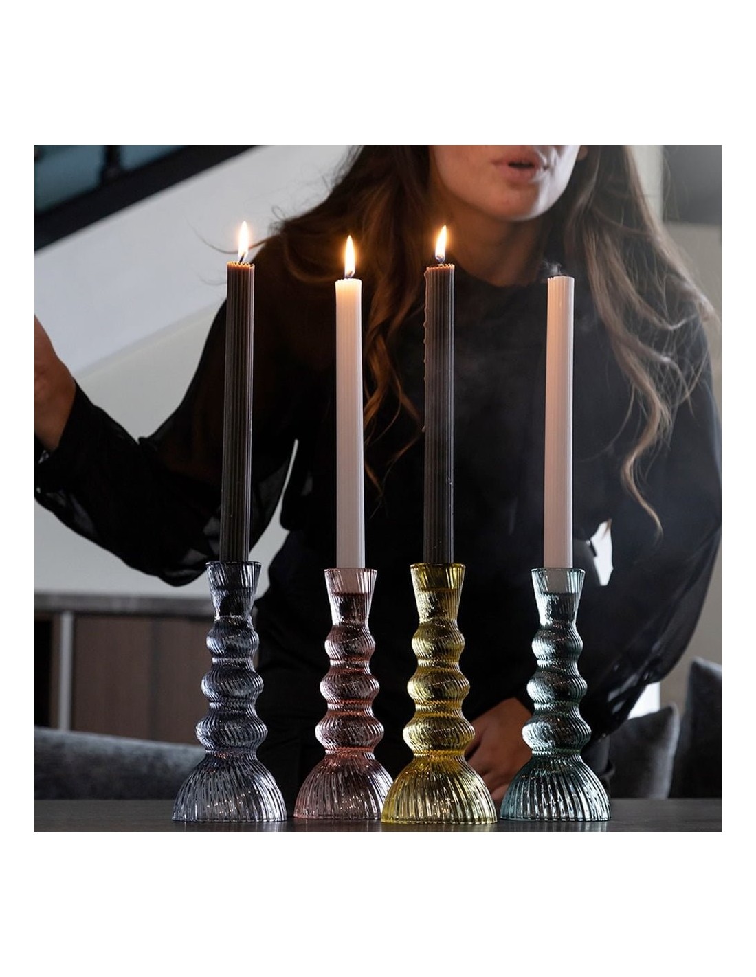 Posiziona questo candeliere grande in vetro Emò come punto focale su tavoli, credenze o camini, conferendo al tuo ambiente un tocco di lusso senza tempo. Che tu stia creando un'atmosfera romantica o desideri aggiungere un elemento di design esclusivo alla tua casa, questo candeliere Emò si distingue per la sua bellezza e stile distintivo.