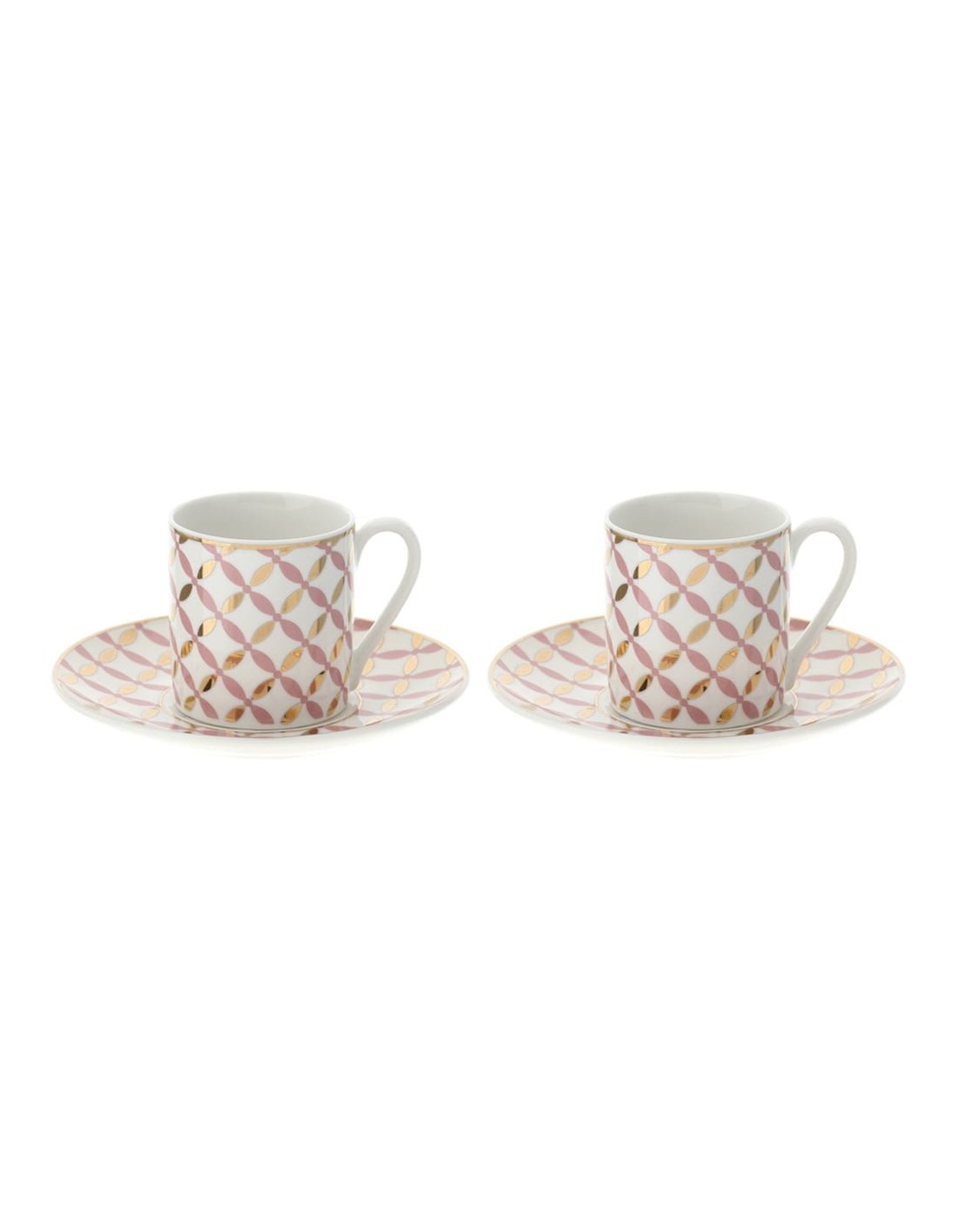 Tazzine da caffè provviste di motivi geometrici in cipria e oro che si intrecciano con il bianco del fondo, su pregiata porcellana New Bone China.