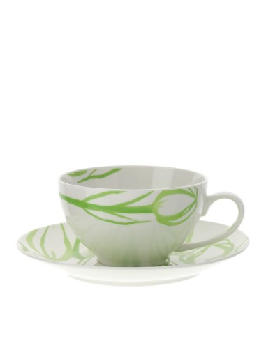 Tazza da colazione con piattino in porcellana bianca dal decoro di tulipani dipinti di verde con effetto pennello.