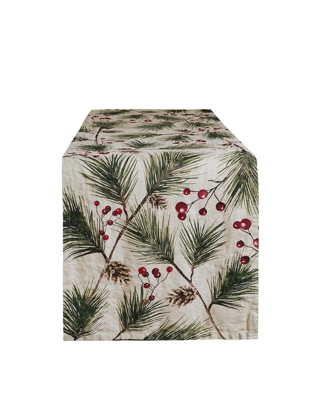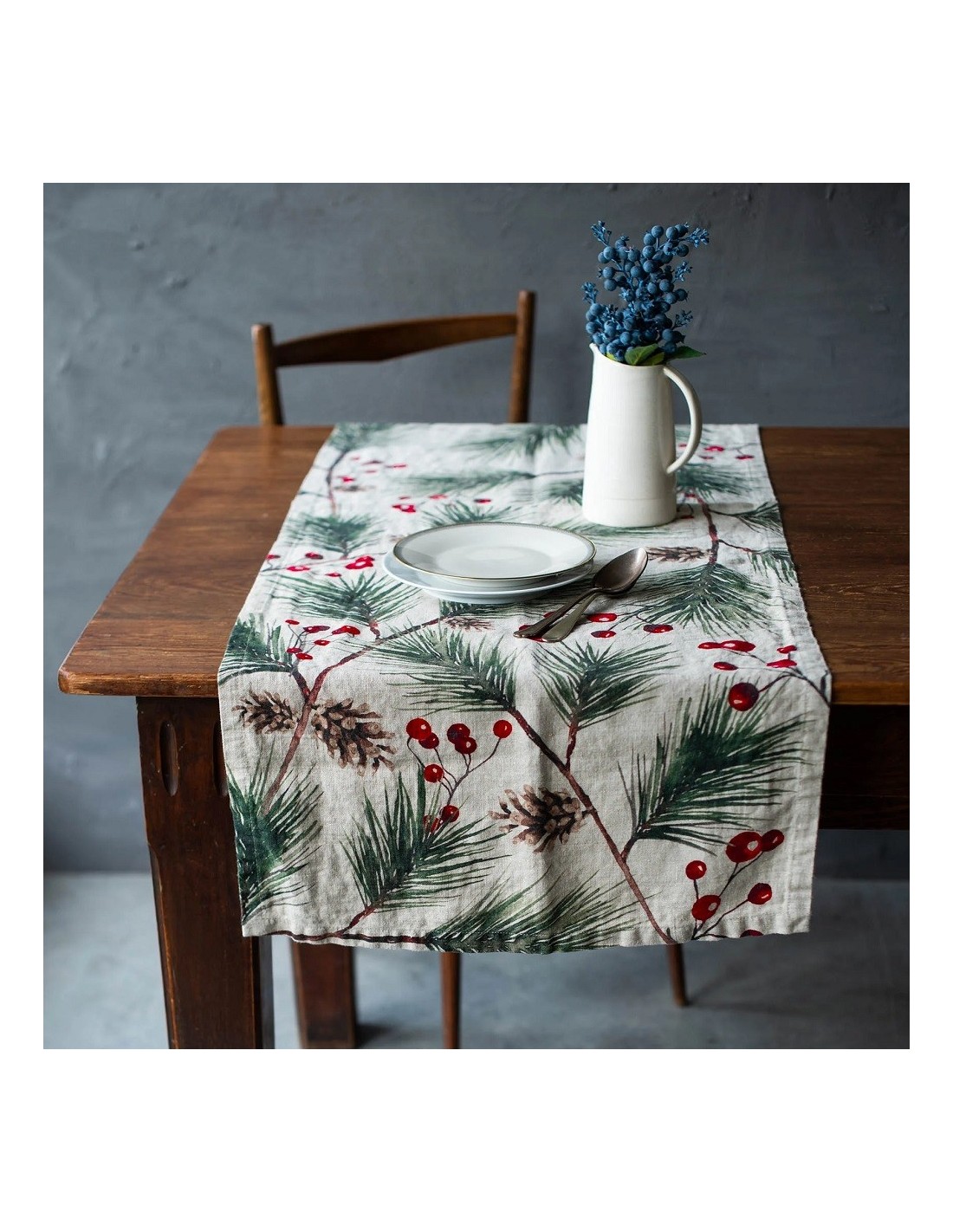 La superficie è arricchita da una delicata decorazione di rami di pino, finemente disegnata, che richiama la bellezza della natura e crea un’atmosfera calda e accogliente. Il motivo, discreto ma decorativo, rende il runner ideale sia per il periodo natalizio sia per l’uso invernale o per chi ama uno stile ispirato agli elementi naturali.
