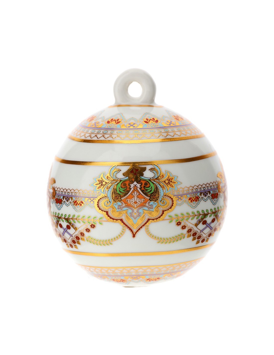 Elegante sfera di Natale in porcellana bianca, impreziosita da un raffinato decoro Thai ricco di dettagli ornamentali. La superficie lucida fa da base a motivi elaborati in tonalità calde e preziose, con disegni ispirati all’arte orientale, caratterizzati da geometrie armoniose, elementi floreali e finiture dorate che donano luminosità e prestigio all’insieme.