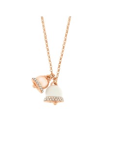 Bracciale in Metallo Oro Rosa con 3 Campanelle Portafortuna Smaltate Azzurro e Rosa insieme a cristallini bianchi.