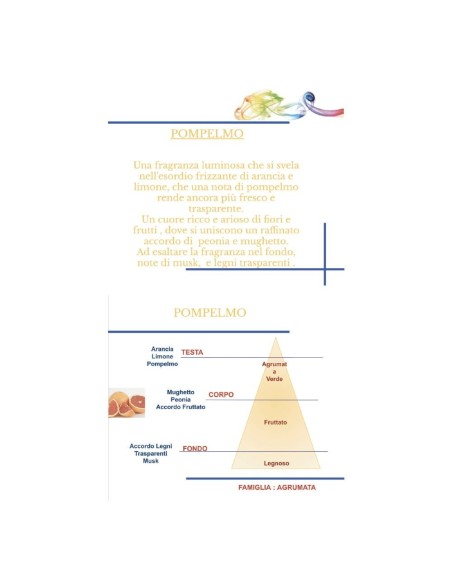 Una fragranza luminosa che si svela nell'esordio frizzante di Arancia e Limone, che con una nota di Pompelmo rende ancora più fresco e trasparente. Un cuore ricco e arioso di fiori e frutti, dove si uniscono un raffinato accordo di Peonia e Mughetto. Ad esaltare la fragranza nel fondo, note di Musk e Legni Trasparenti.
