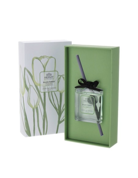 Set Profuma ambiente con bottiglia dalla fragranza "Black Forest" e bastoncini diffondi fragranza racchiuso in una scatola regalo dai decori di Tulipani verdi con effetto pennello.