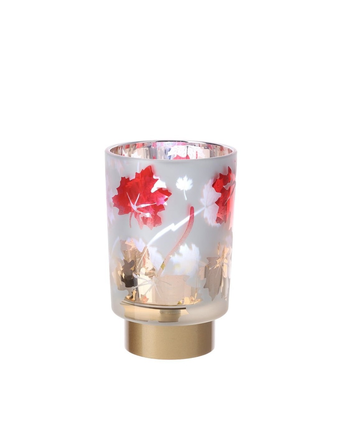 Lampada in vetro satinato con decorazione foliage in rosso e oro su base dorata.