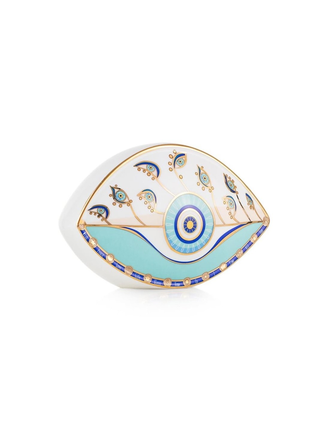 Aggiungi un tocco artistico e funzionale alla tua scrivania grazie all'elegante fermacarte della Emò con sagoma ad occhio greco "Mati" in ceramica dai decori di tanti occhi Mati.