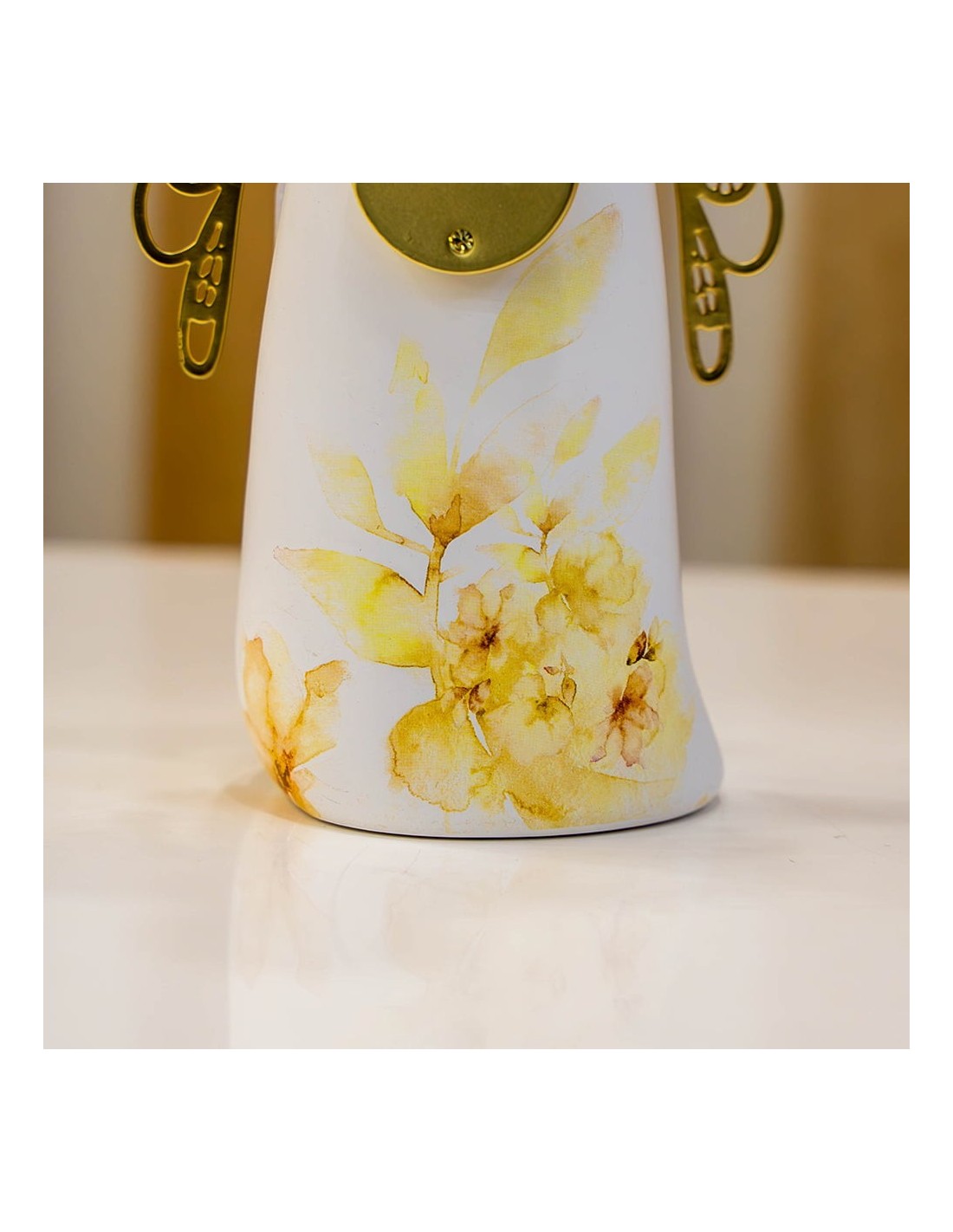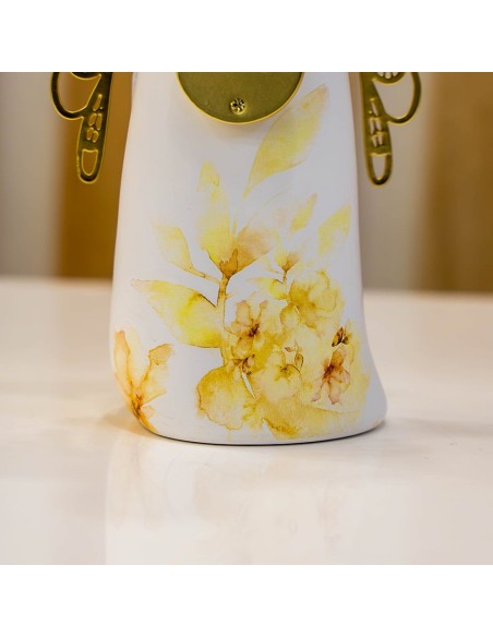 Angelo stilizzato con ali, ciondolo tondo in metallo smaltato su cui è incastonato uno strass e inciso "Felicità" con dei fiori dipinti di giallo della collezione You are an angel.
