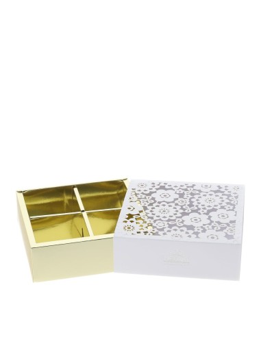 La scatola portaconfetti, realizzata in cartoncino laminato oro con decori traforati bianchi in sleeve taglio laser.