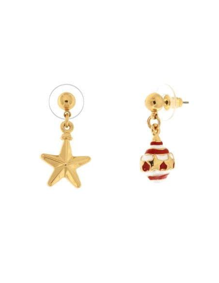 Orecchini dorati con stella e pallina natalizia smaltati multicolore.