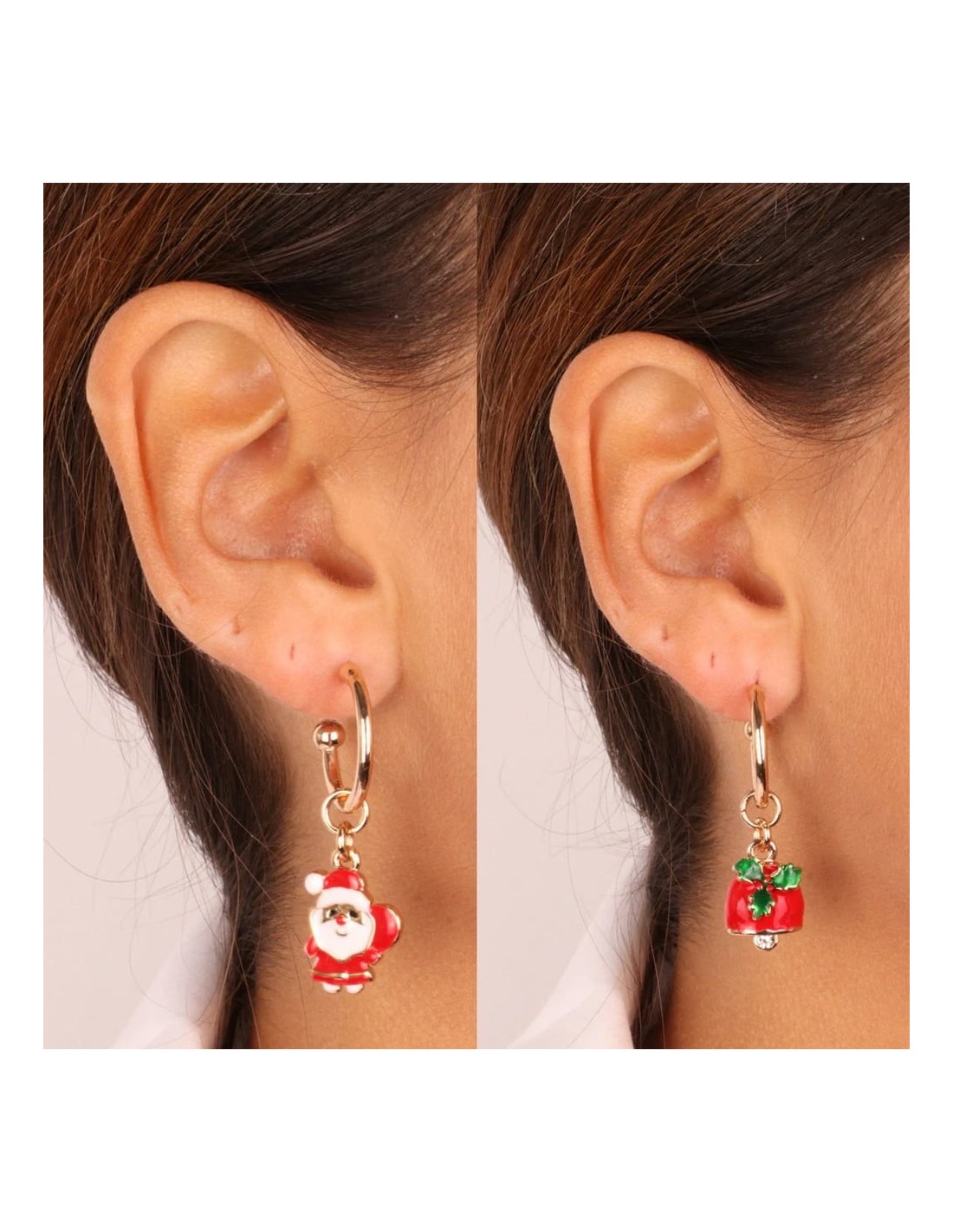 Orecchini dorati con Babbo Natale e campanella Agrifoglio smaltati multicolore.
