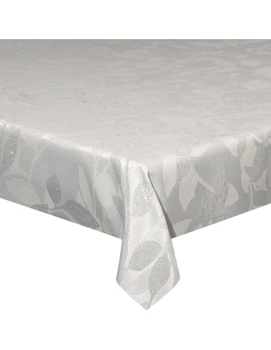 La base bianca crea un fondo pulito e luminoso, mentre le foglie ricamate in grigio aggiungono un tocco di eleganza e stile. Le foglie sono disposte in modo armonioso lungo la tovaglia, creando un motivo naturale e incantevole che richiama l'atmosfera natalizia.