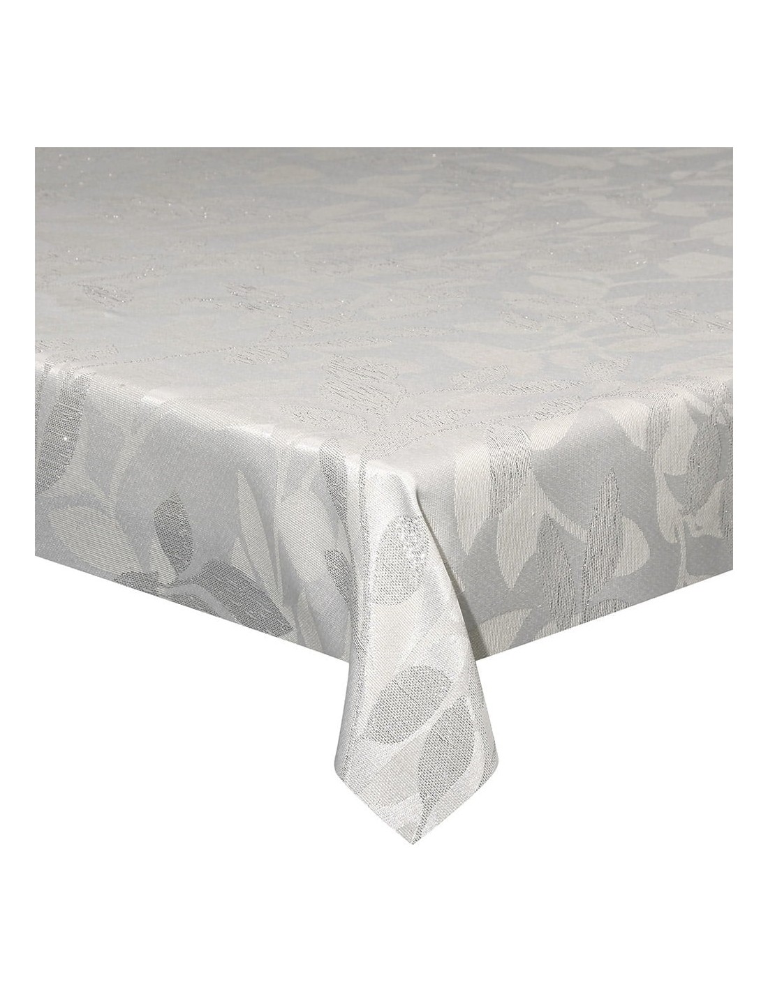 La base bianca crea un fondo pulito e luminoso, mentre le foglie ricamate in grigio aggiungono un tocco di eleganza e stile. Le foglie sono disposte in modo armonioso lungo la tovaglia, creando un motivo naturale e incantevole che richiama l'atmosfera natalizia.
