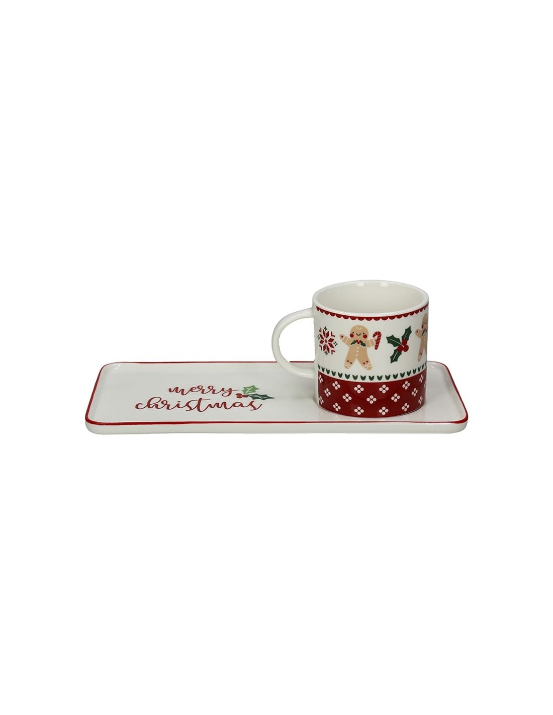 Set Mug con piattino natalizio rettangolare, caratterizzato da una grafica vivace di dolcetti “Ginger” di marzapane e oggetti tipici natalizi.