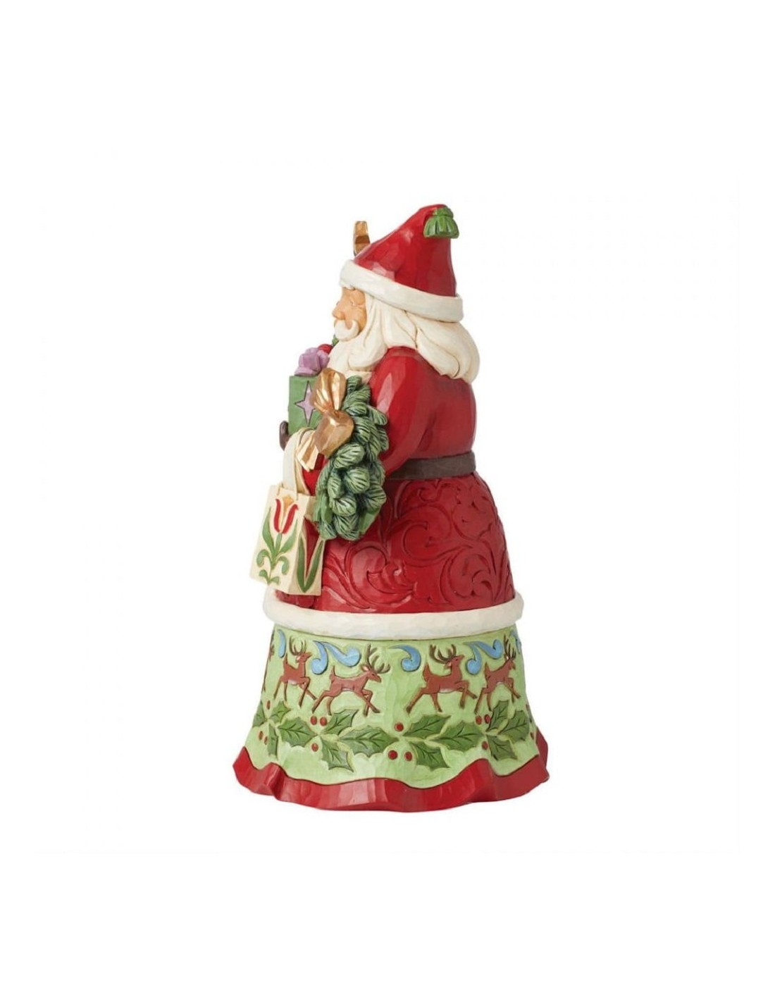 Questo Babbo Natale colorato di Jim Shore ha le mani piene di regali! Con una corona, un albero di Natale in miniatura, sacchetti regalo, scatole e ornamenti, questo intricato Babbo Natale sorride con un cappello con nappe. I mantelli di Babbo Natale sono decorati con rosemaling e renne.
