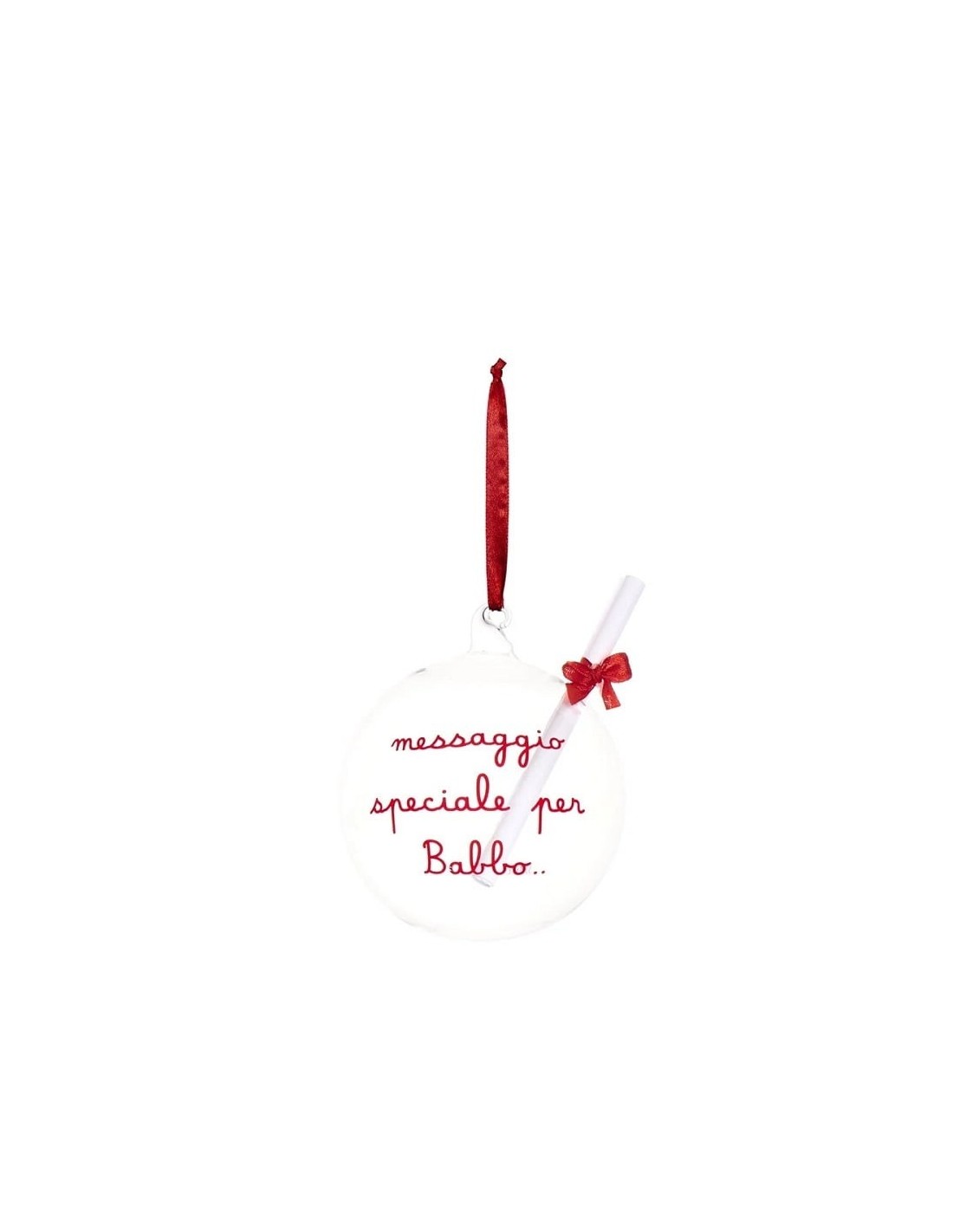Incantevole sfera natalizia trasparente con la scritta serigrafata 'Messaggio speciale per Babbo...'. Al suo interno è presente un piccolo foro che custodisce una letterina, dove puoi scrivere un messaggio personale per Babbo Natale.