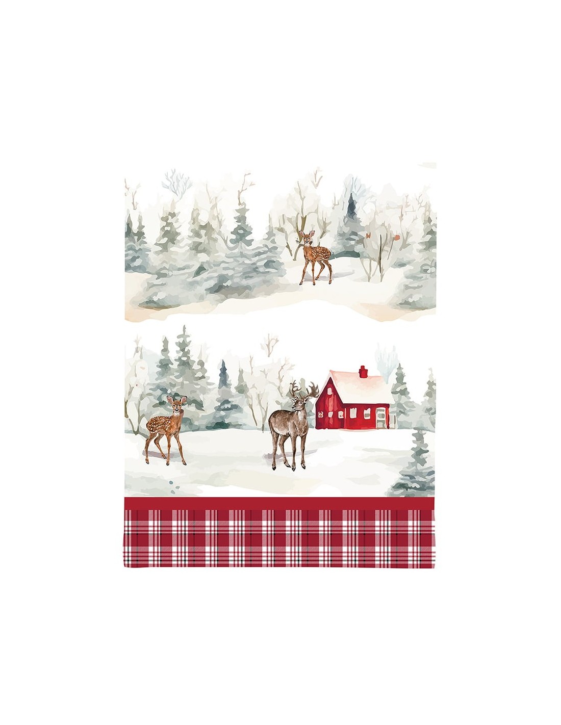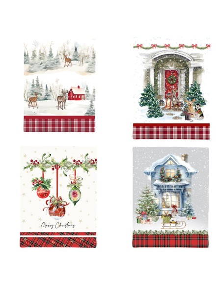 La stampa è dettagliata e colorata, richiamando l'allegria e lo spirito delle festività con colori come il rosso, il verde e il bianco, tipici del Natale. Questo canovaccio non solo è utile per le attività quotidiane in cucina, ma può anche essere utilizzato come elemento decorativo, appeso o esposto, aggiungendo un tocco di eleganza festiva.