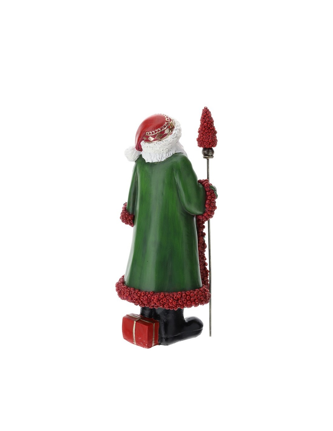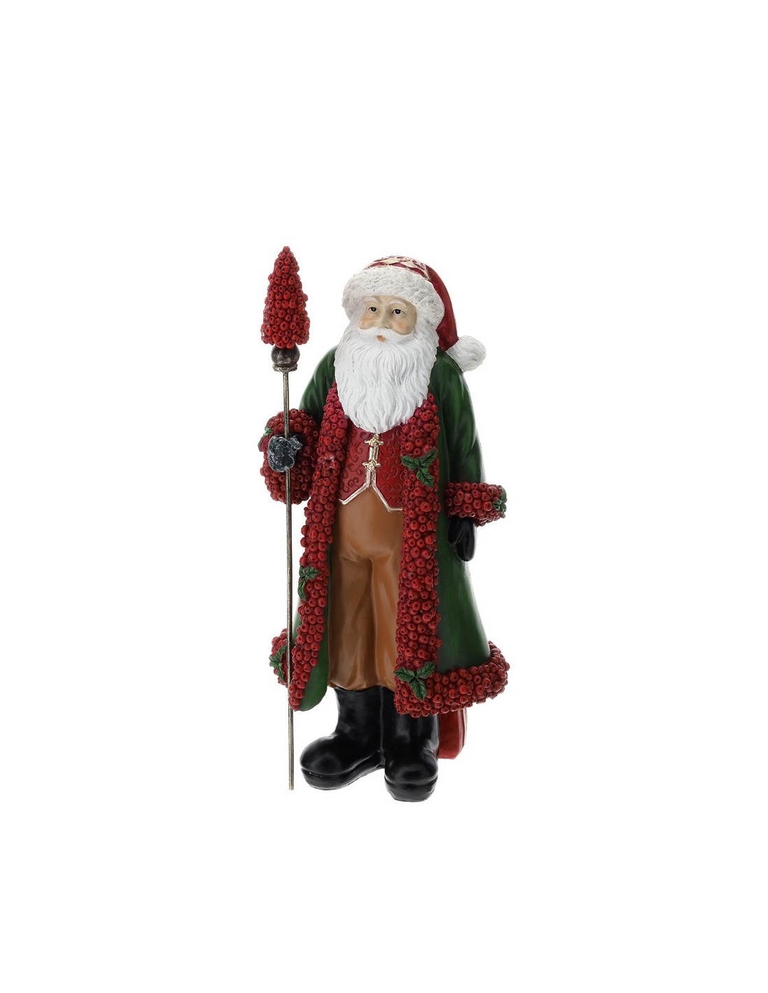 Splendida statuina raffigurante Babbo Natale, realizzata con cura nei dettagli e rifinita a mano. Indossa un lungo mantello verde bordato da vivaci bacche rosse, simbolo di gioia e tradizione natalizia, che donano un tocco raffinato e originale alla figura. Nella mano regge un elegante bastone decorato, completando l’aspetto solenne e festoso. Perfetto come complemento d’arredo natalizio, dona calore e atmosfera magica a salotti, ingressi o centrotavola, trasformando ogni ambiente in un’accogliente scenografia di festa.