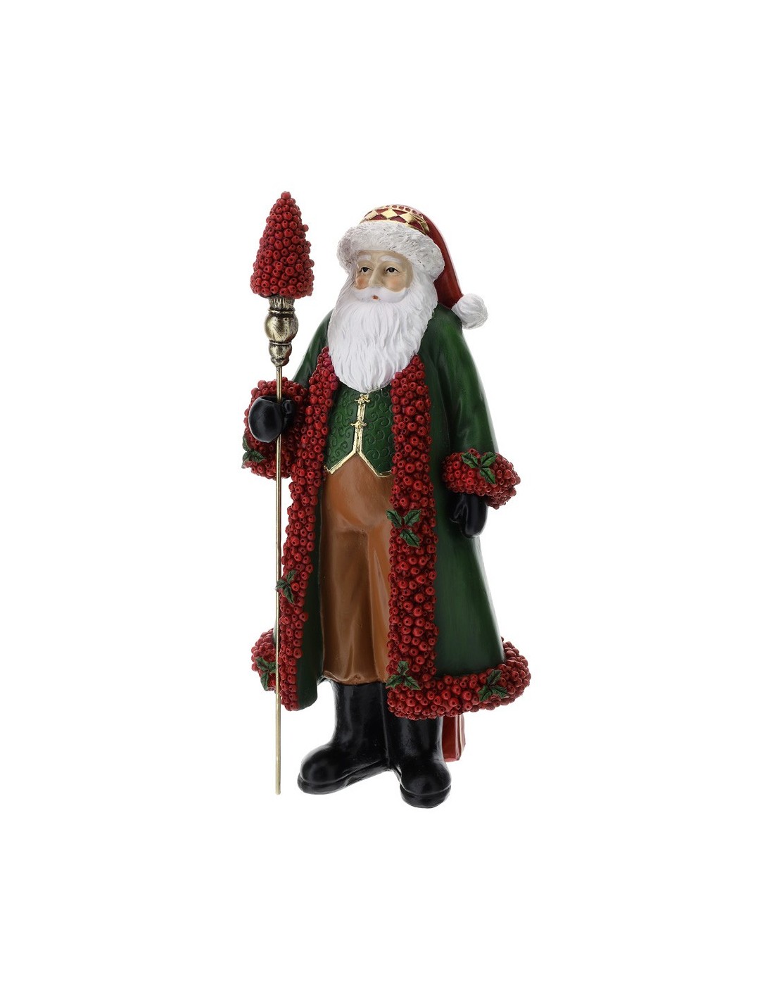 Splendida statuina raffigurante Babbo Natale, realizzata con cura nei dettagli e rifinita a mano. Indossa un lungo mantello verde bordato da vivaci bacche rosse, simbolo di gioia e tradizione natalizia, che donano un tocco raffinato e originale alla figura. Nella mano regge un elegante bastone decorato, completando l’aspetto solenne e festoso. Perfetto come complemento d’arredo natalizio, dona calore e atmosfera magica a salotti, ingressi o centrotavola, trasformando ogni ambiente in un’accogliente scenografia di festa.