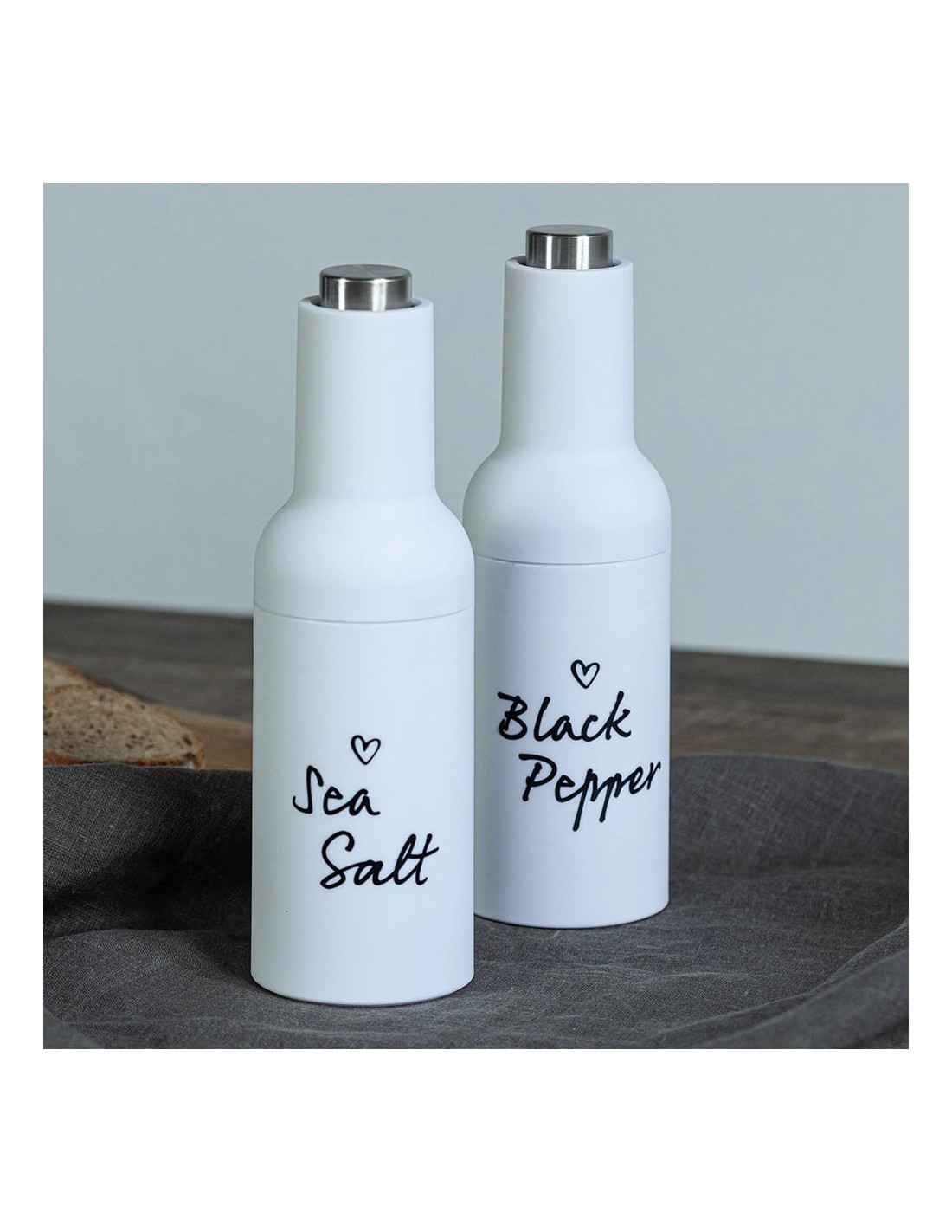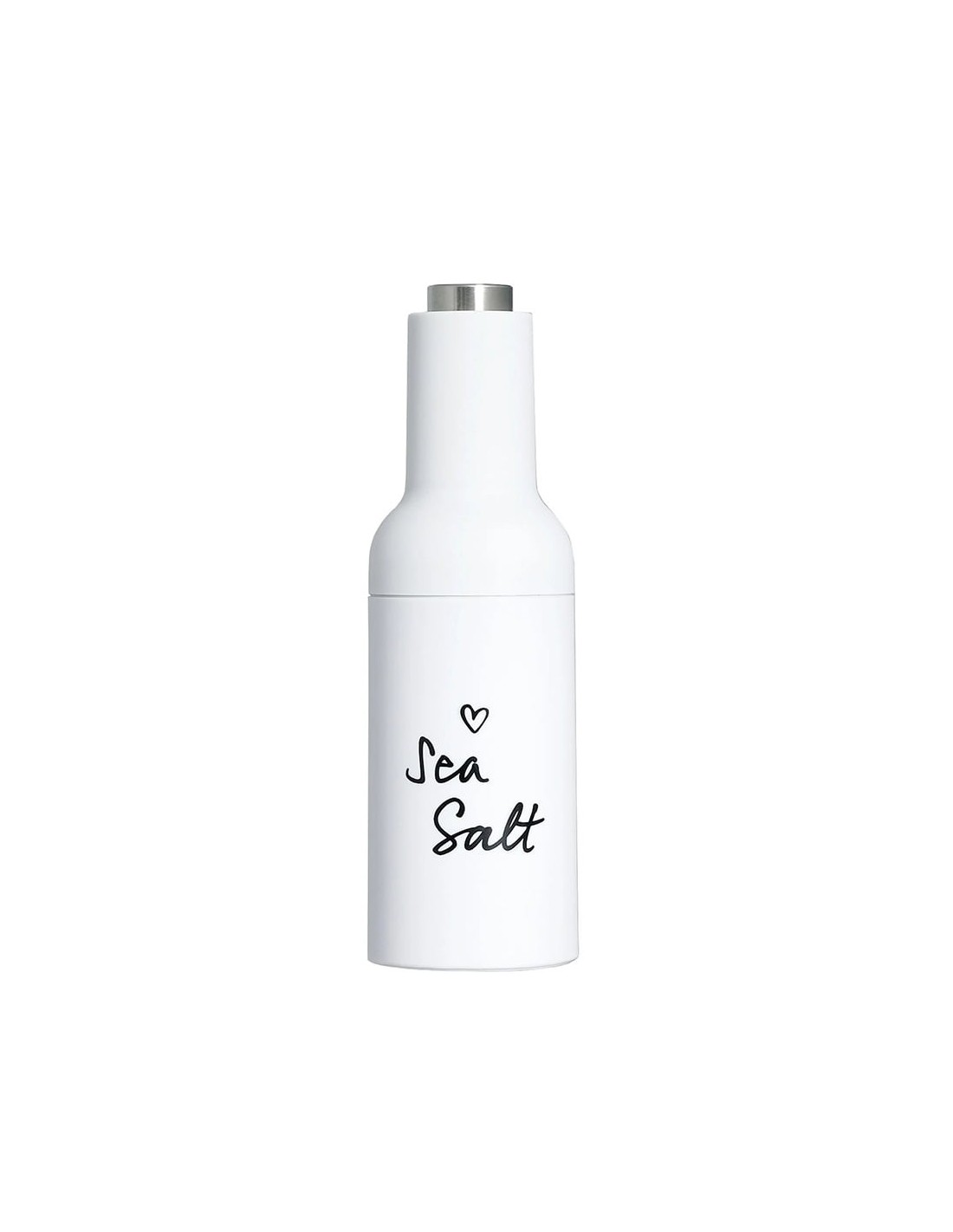 Il macina sale elettrico ha l'azionamento automatico a gravità: gira il macina sale verso il basso e inizierà a macinare da solo, quando hai finito basta rimetterlo in posizione verticale. Il decoro Sea Salt è in colore nero sul fondo bianco.