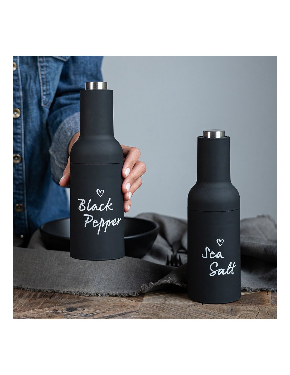 Il macinapepe elettrico ha l'azionamento automatico a gravità: gira il macina sale verso il basso e inizierà a macinare da solo, quando hai finito basta rimetterlo in posizione verticale. Il decoro Sea Salt è in colore nero sul fondo bianco.