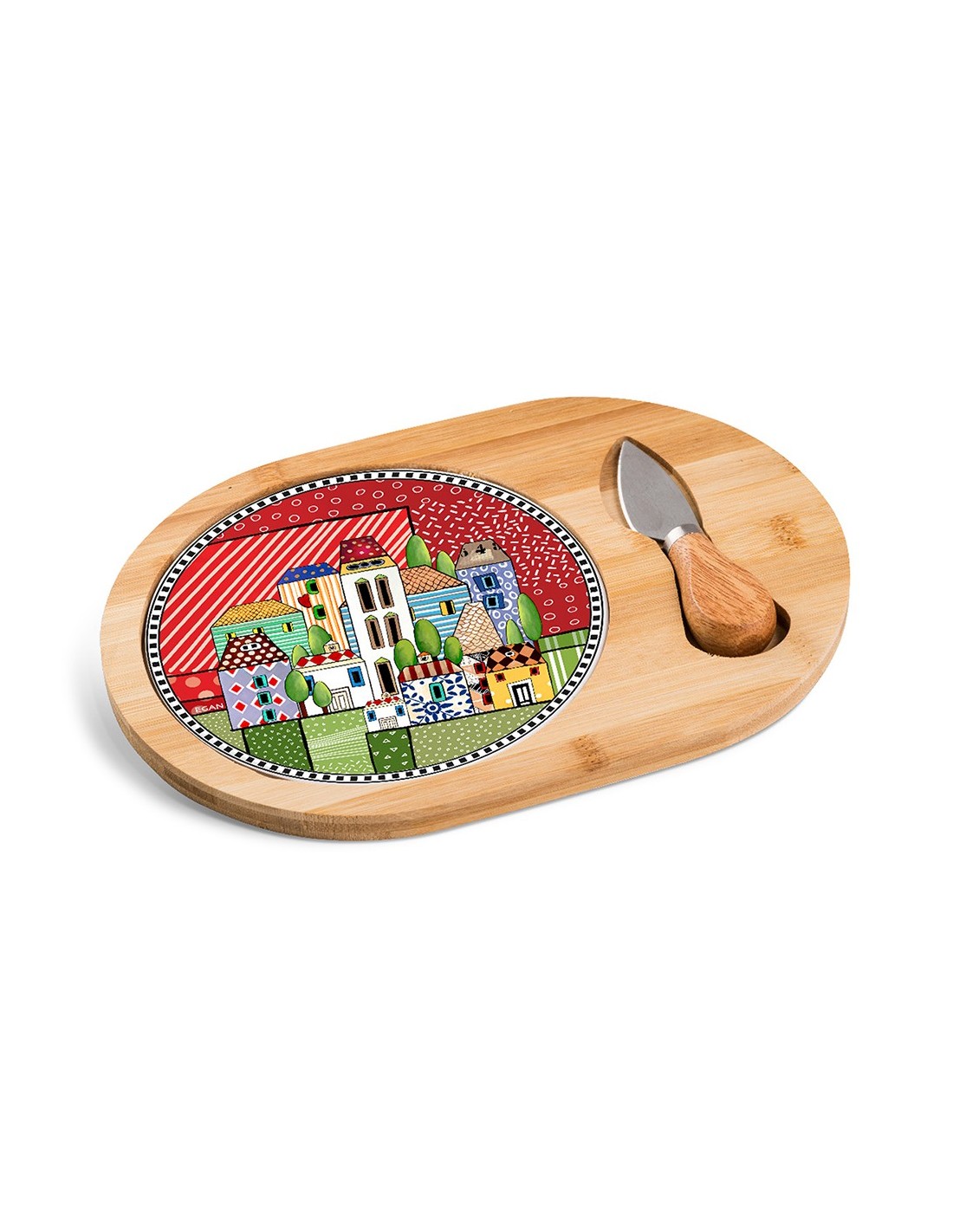 La base è realizzata in legno naturale, resistente e piacevole al tatto, perfetta per un utilizzo quotidiano o per apparecchiature più ricercate. La base tonda in ceramica incastonata al centro è impreziosita da una vivace grafica raffigurante un colorato borgo in stile artistico “Paese Mio”, che dona un tocco di allegria e originalità alla tavola.