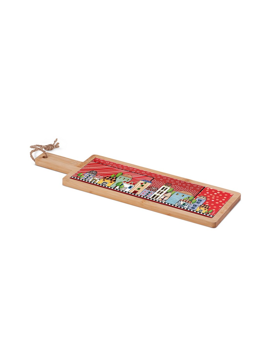 La parte centrale è arricchita da una vivace e coloratissima decorazione in ceramica smaltata, caratterizzata da un paesaggio urbano stilizzato tipico della linea Paese Mio. I colori intensi e i dettagli grafici conferiscono al tagliere un aspetto artistico e contemporaneo, perfetto per aggiungere personalità alla cucina o alla tavola apparecchiata.