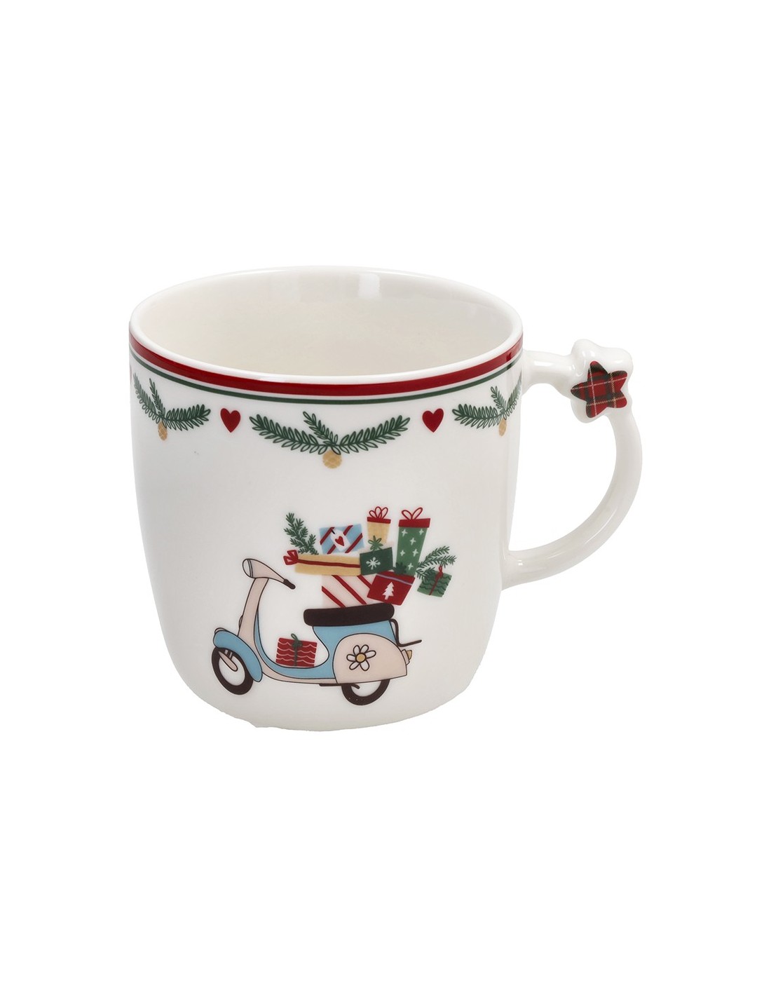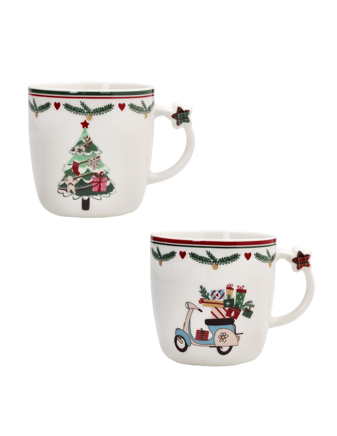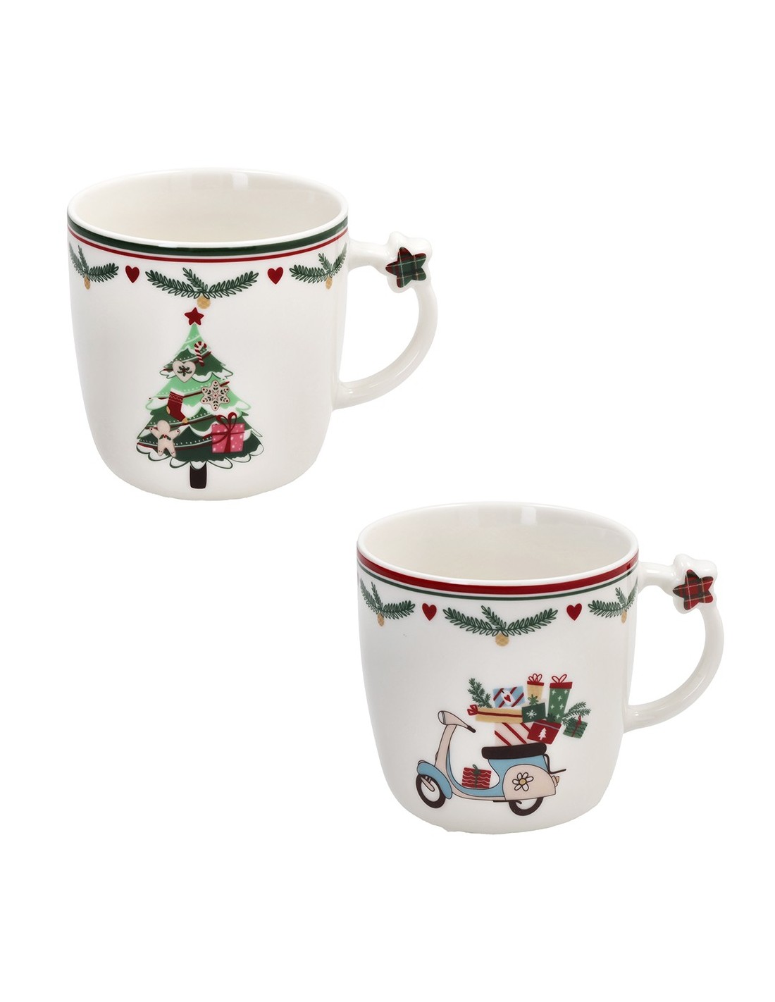 Il set 2 tazze natalizie, appartenente alla linea New Milk & Co. di Andrea Fontebasso, con albero e moto con regali è composto da due tazze in porcellana bianca. Ogni tazza presenta una decorazione unica: su una è raffigurato il classico albero natalizio, mentre sull’altra una moto carica di pacchi regalo, simbolo di gioia e tradizione. Entrambe sono arricchite da un raffinato motivo scozzese sul bordo superiore e da una stellina in rilievo 3D applicata sul manico, che dona un tocco originale e festoso.