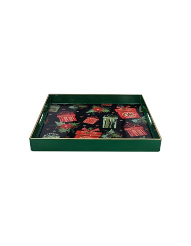 Il vassoio natalizio in polipropilene con manici verdi è pratico e resistente ed è perfetto per servire bevande, dolci o snack durante le festività. La struttura leggera ma robusta è dotata di due comodi manici laterali in verde che assicurano una presa salda e sicura. La base del vassoio è decorata con un vivace disegno a tema natalizio, raffigurante numerosi pacchi regalo colorati su un elegante sfondo nero scuro, creando un contrasto raffinato e festoso. Ideale per arricchire la tavola di Natale o per servire con stile durante pranzi e cene in famiglia.