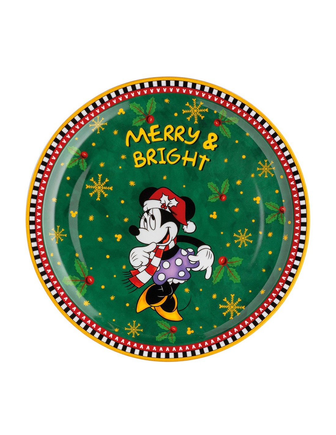 Piatto panettone natalizio decorato con il personaggio Disney di Minnie Mouse, parte della collezione "Disney Winter Magic". Il piatto presenta uno sfondo verde con motivi natalizi di agrifoglio, fiocchi di neve dorati e dettagli colorati che richiamano lo spirito festivo. La scritta “Merry & Bright” aggiunge un tocco allegro e brillante.
