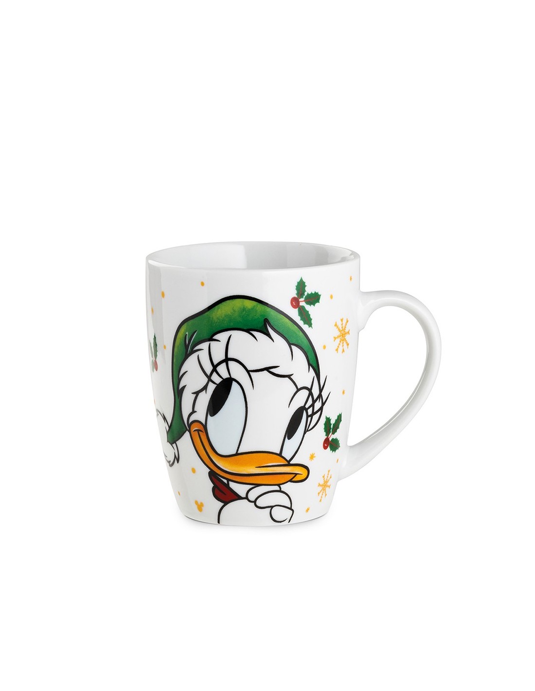 Mug natalizia in ceramica decorata con il volto di Paperina, parte della collezione "Disney Winter Magic". Su uno sfondo bianco arricchito da stelle dorate, agrifogli, il design mette in risalto l’espressione simpatica e festosa di Paperina, che indossa il cappello natalizio verde.