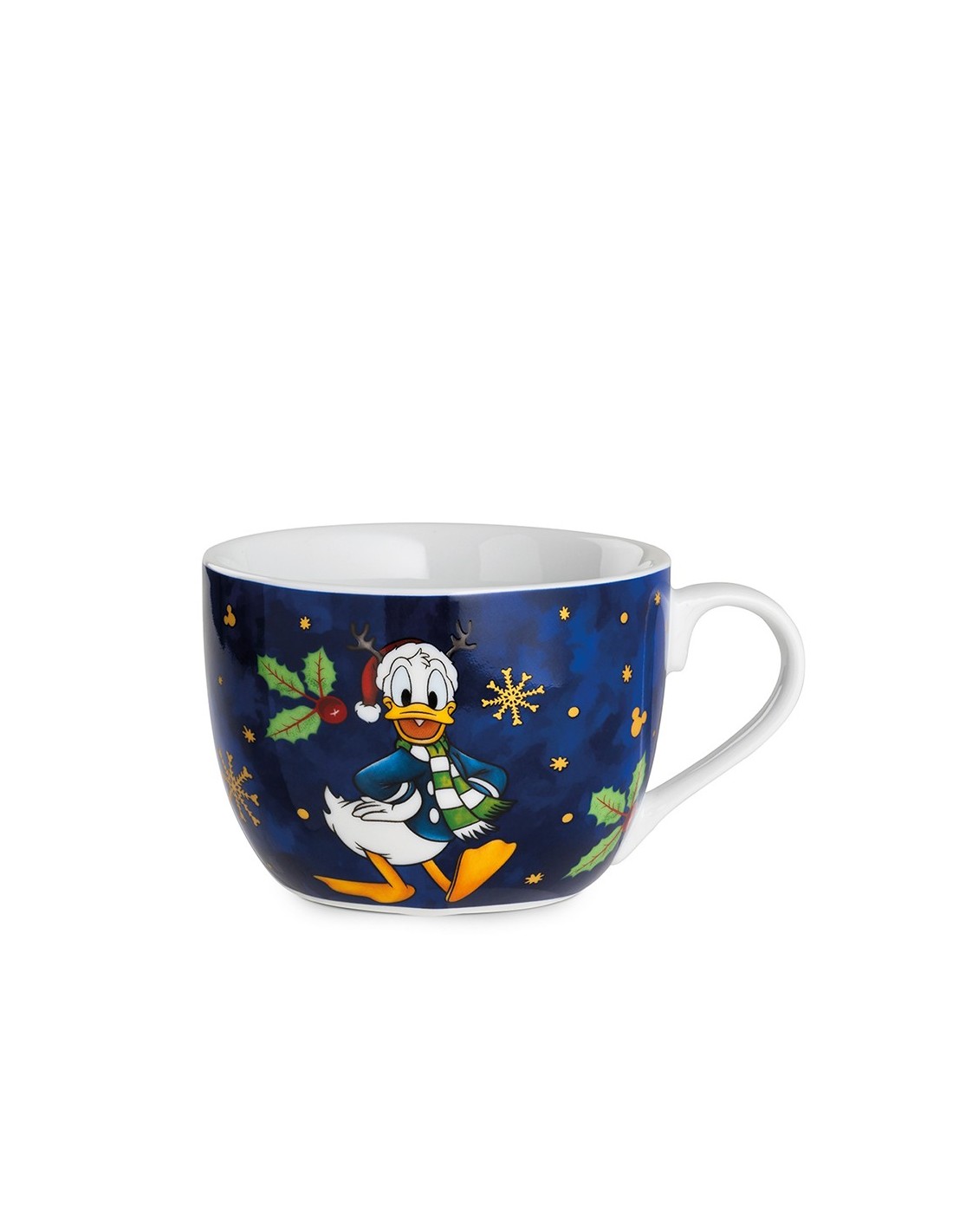 La tazza colazione presenta un carico sfondo blu a tema natalizio decorato con fiocchi di neve, agrifogli e piccoli dettagli dorati. Al centro spicca Paperino, raffigurato con cappello di Natale e sciarpa invernale, in una posa allegra e festosa.