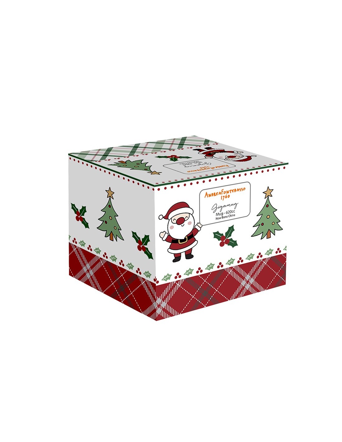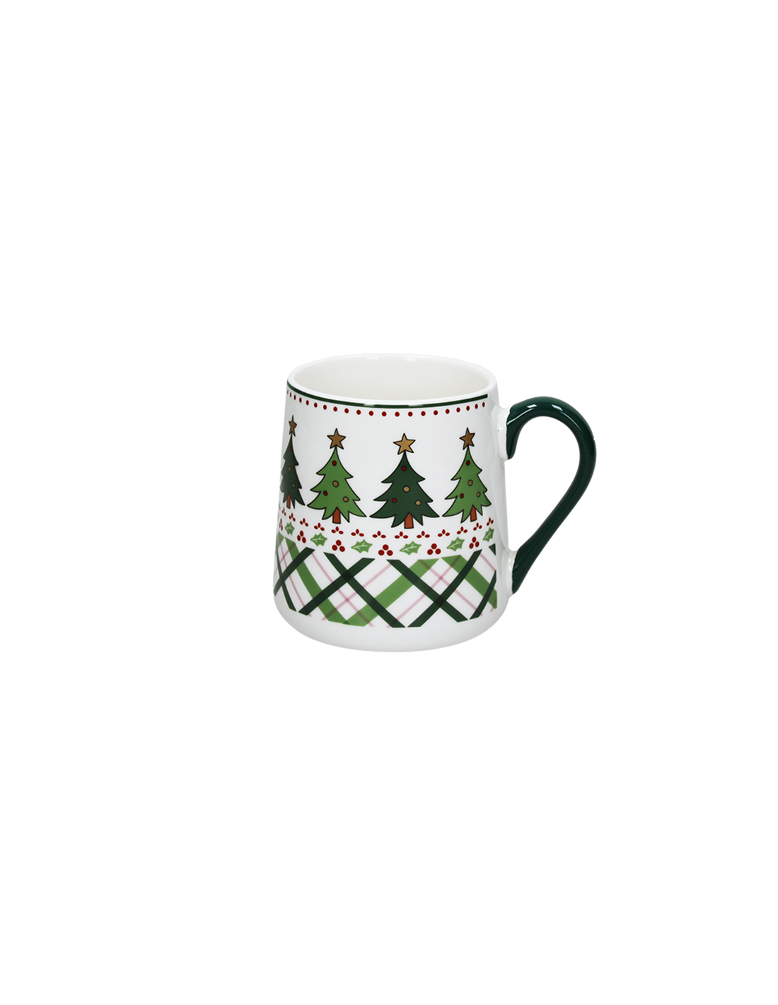 Tazza da colazione natalizia della linea New Milk e decoro con albero di Natale colorato su sfondo bianco. Il manico in verde aggiunge un tocco di eleganza e raffinatezza, rendendo questa tazza perfetta per le festività. Ideale per gustare caffè, cappuccino, tè o cioccolata calda, questa tazza non è solo funzionale ma anche un'accattivante decorazione per la tua tavola natalizia, portando un sorriso e un’atmosfera festosa ad ogni colazione.