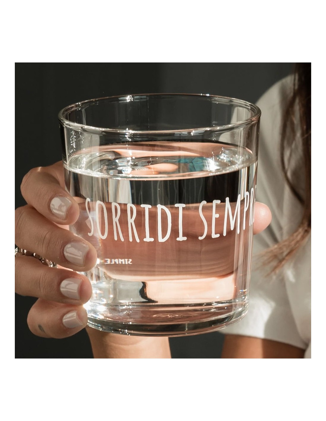 Servizio da 6 bicchieri in vetro temperato con serigrafato "Sorridi sempre" in Bianco perfetti nell'uso quotidiano così in caso ci sentiamo giù di morale c'è il bicchiere che ci tira su.