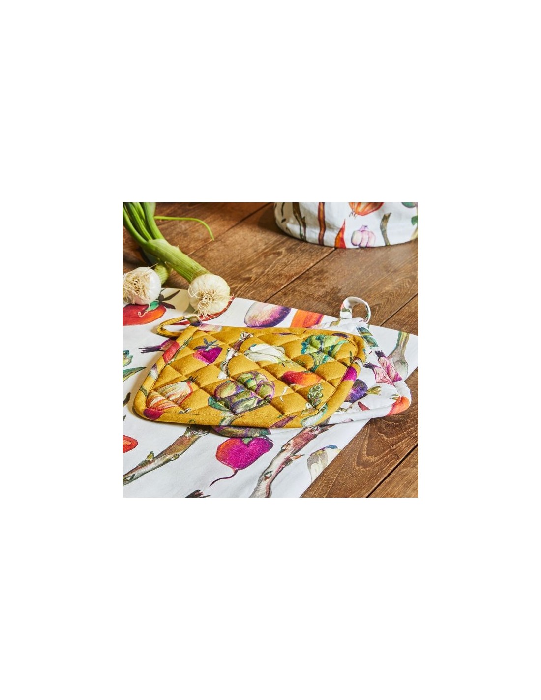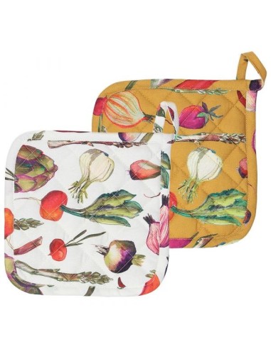 Set 2 Presine da forno con decori di ortaggi vari su 2 fondi colorati, molto utile per prendere le pietanze cucinate nel forno e quindi articolo inevitabile se si vogliono evitare scottature indesiderate.