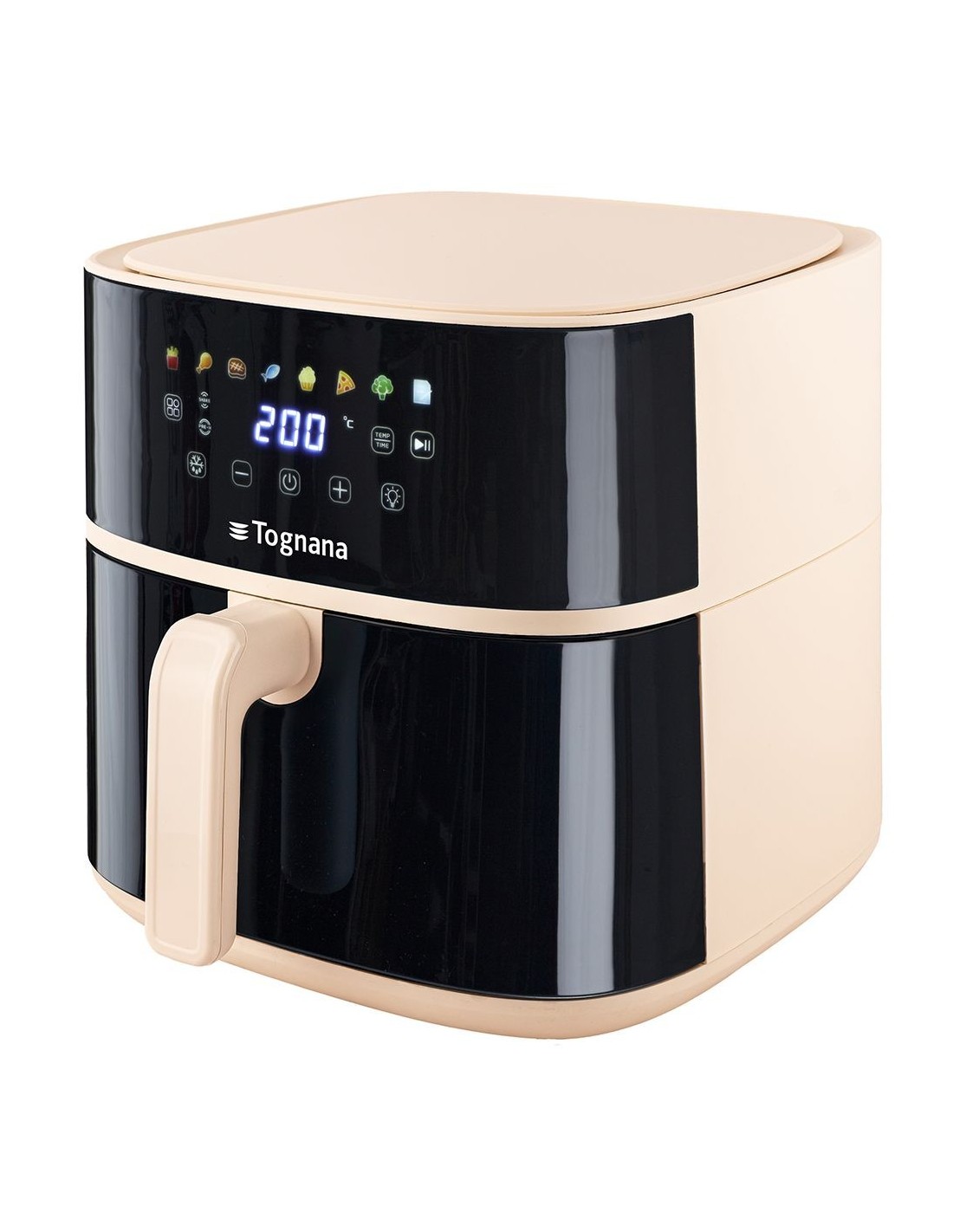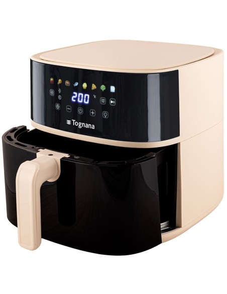 Con un display digitale a colori e 8 programmi preimpostati la friggitrice ad aria 8 L beige Champagne Iridea fa parte dell'ampia gamma di piccoli elettrodomestici Tognana disponibili in più colorazioni dal look moderno e innovativo, adatto a qualsiasi cucina! Ideale per cuocere senza l'aggiunta di olio fino a 6 porzioni, la friggitrice ad aria da 8 L Iridea beige con doppia resistenza, superiore ed inferiore, ti permette di sbizzarrirti con molteplici ricette da poter monitorare a vista grazie alla finestra in vetro, e facilissime da preparare con gli 8 programmi preimpostati in dotazione: patatine, pollo, carne, crostacei, carne, pesce, dolci, verdure e non solo, con un metodo di cottura sano e gustoso! Tra le principali funzioni presenta inoltre un timer di 60 minuti, la temperatura regolabile da 80° a 200°, il promemoria di scuotimento durante la cottura, lo spegnimento automatico, la funzione scongelamento, la protezione da surriscaldamento, e un sistema di interruzione dell'alimentazione quando si apre lo sportello. La friggitrice ad aria 8 L Iridea Champagne Beige è disponibile anche nella colorazione Carta da Zucchero, e in diverse capacità per soddisfare ogni tua esigenza. *La griglia estraibile è lavabile in lavastoviglie; il corpo della friggitrice è lavabile solo a mano con panno morbido e leggermente inumidito.