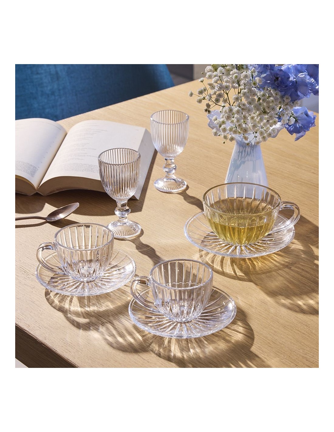 Rendi speciale ogni pausa caffè con il set da 6 tazze in vetro trasparente con piattino linea Rib, perfetto per chi ama unire eleganza e praticità.