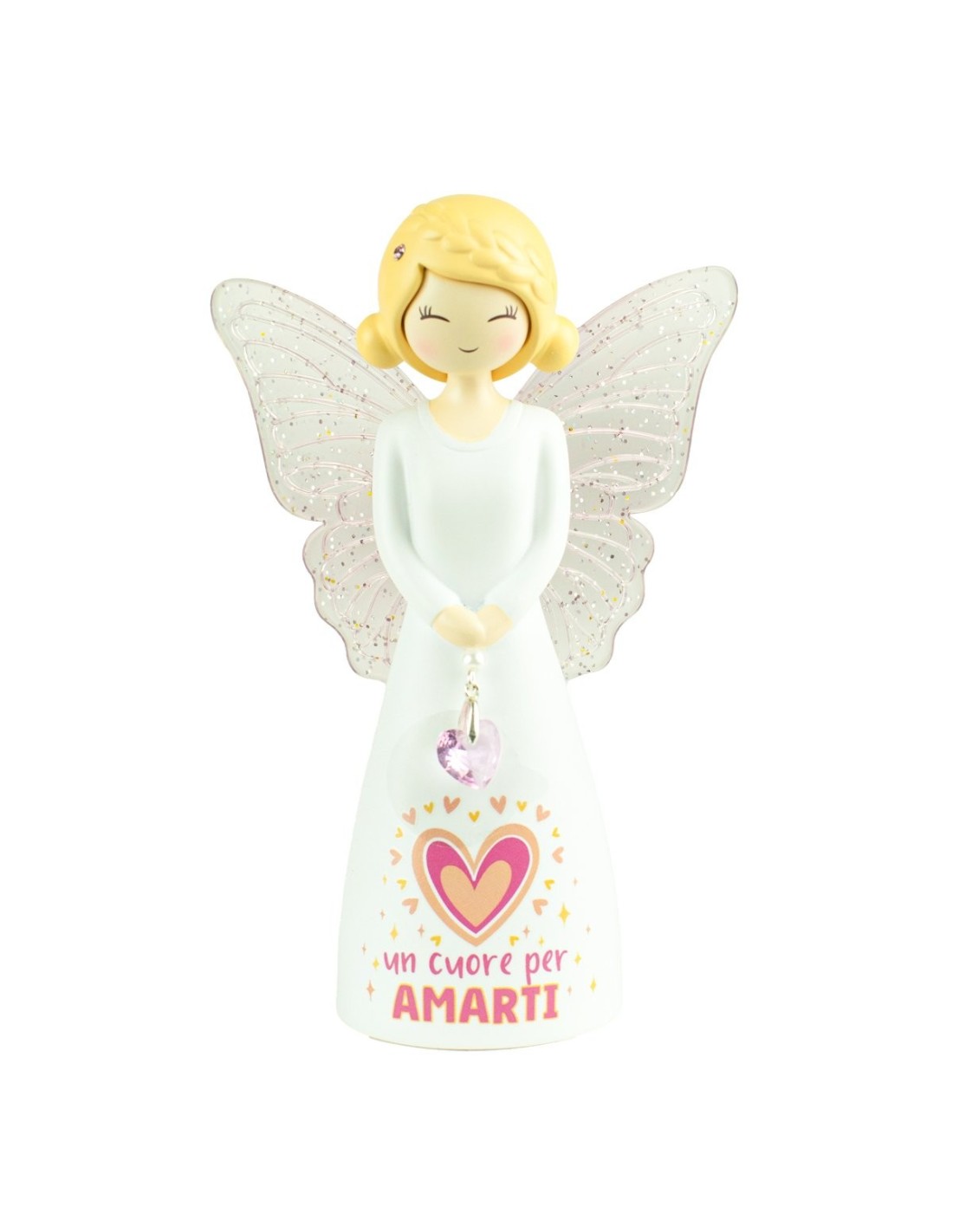 Questo angelo è caratterizzato da splendide ali rosa glitterate, capelli biondi intrecciati e un cuore rosa scintillante che racchiude un messaggio speciale: “Un cuore per amarti”. Ideale come idea regalo romantica, per occasioni speciali o per arricchire con eleganza ogni ambiente della casa.