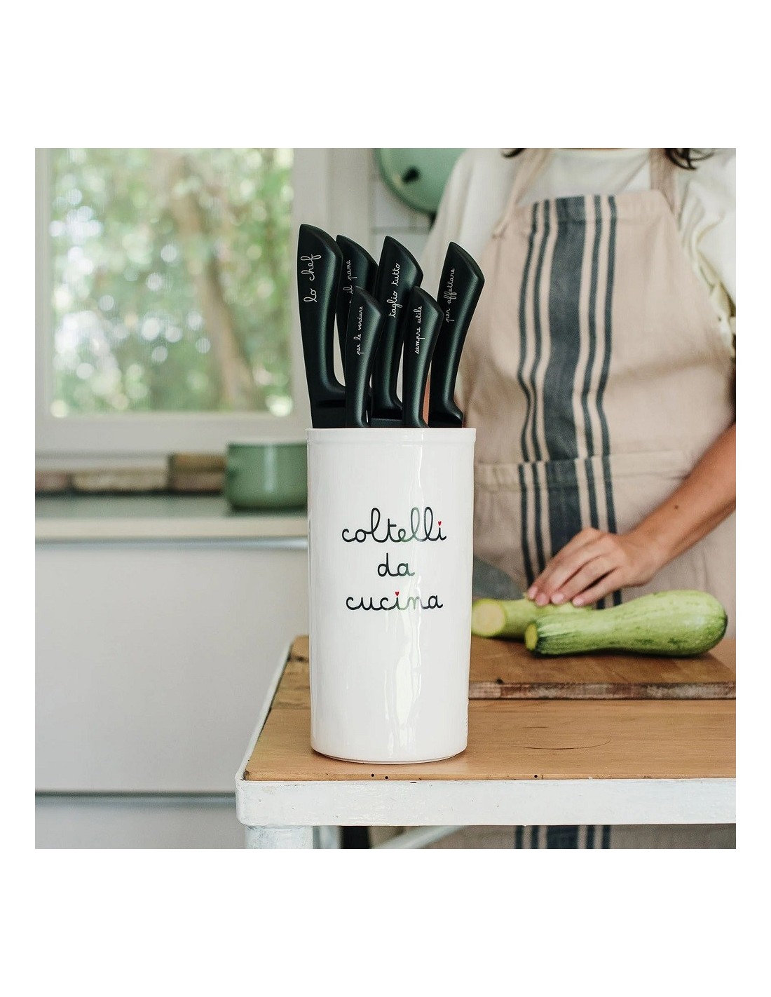 Pratico e sicuro portacoltelli da cucina con decoro "coltelli da cucina", ideale per tenere in ordine e a portata di mano i coltelli durante la preparazione dei pasti. Realizzato con materiali resistenti e durevoli, il design moderno e funzionale si adatta perfettamente a qualsiasi ambiente di cucina, offrendo un supporto stabile per mantenere i coltelli ben organizzati. Perfetto per ottimizzare lo spazio sul piano di lavoro e garantire una cucina ordinata e professionale.