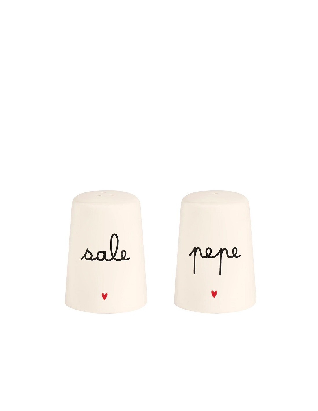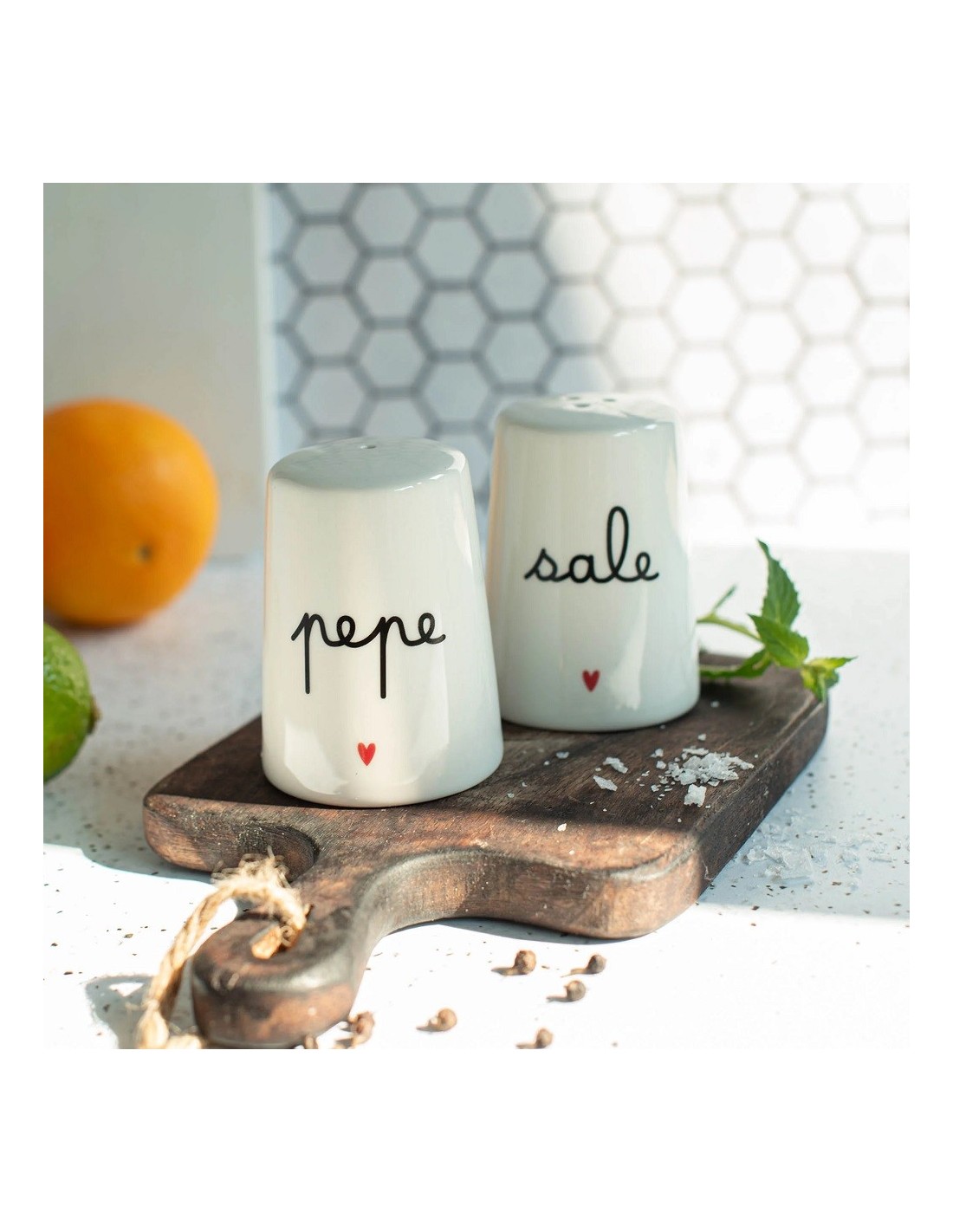 Il set presenta il Decoro Sale quanto basta - Un pizzico di pepe in colore nero accompagnato da un grazioso cuore rosso.